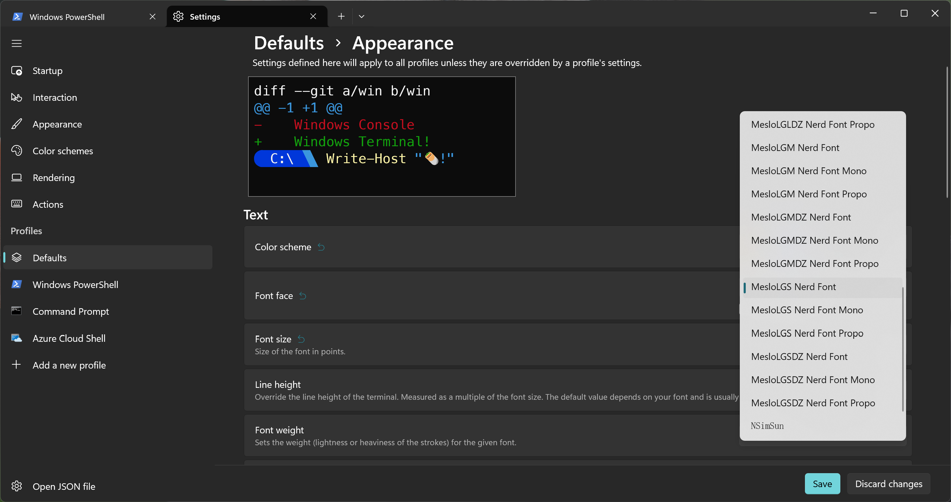설치기 완료되면 Powershell Settings > Profiles > Defaults > Appreance > Font 를 변경해 주세요.