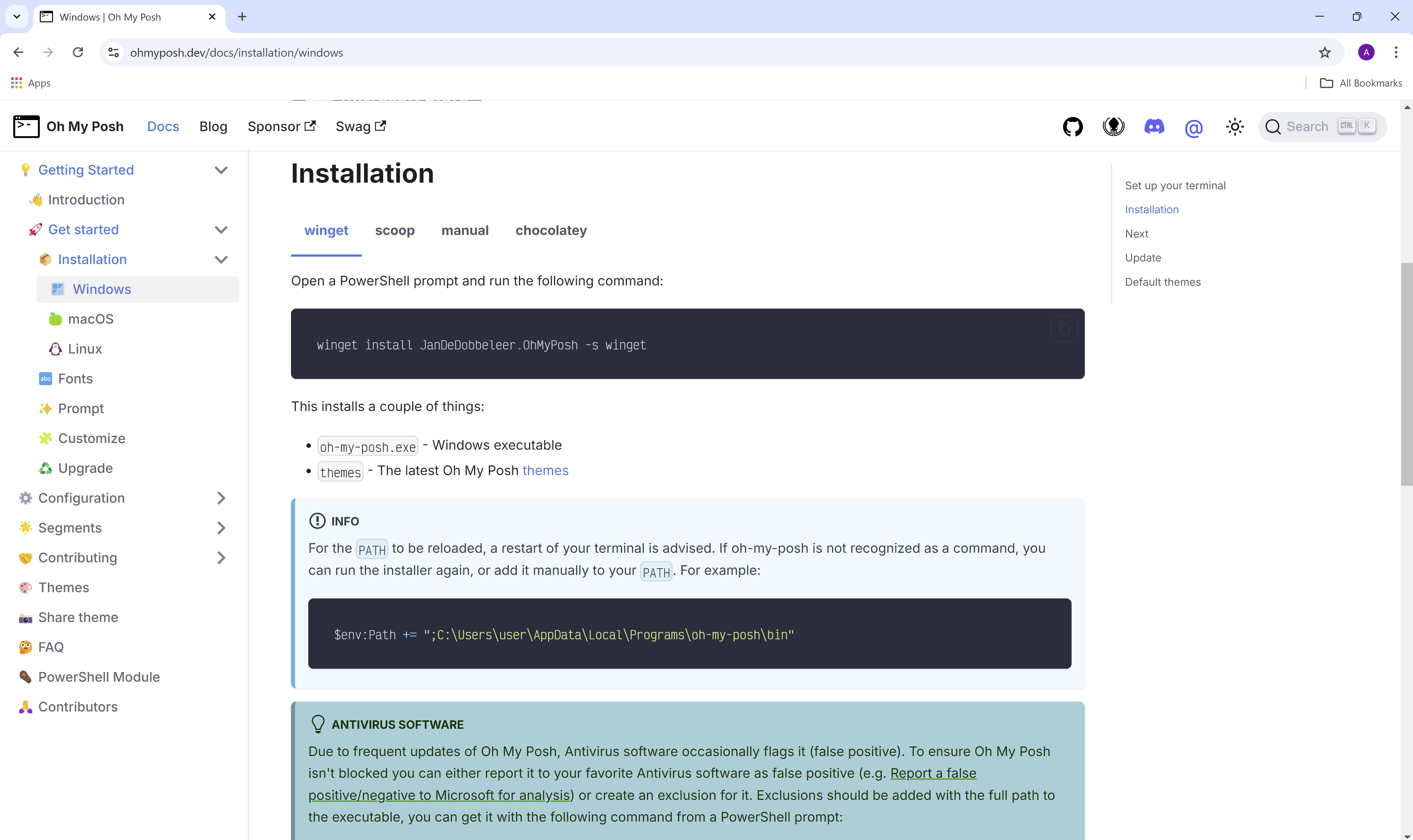 먼저 Oh My Posh홈페이지를 방문합니다. 홈페이지에서 설치방법과 사용가능한 테마의 확인이 가능합니다.